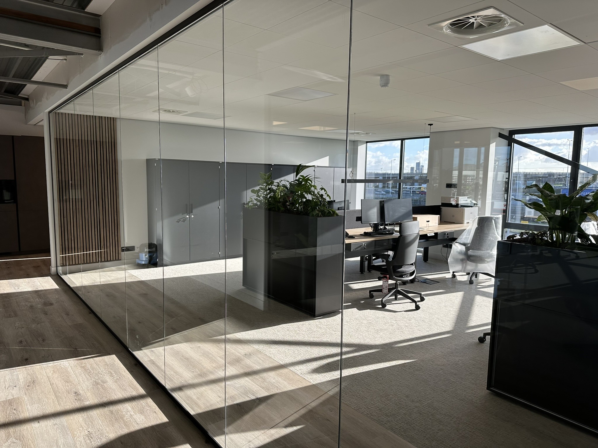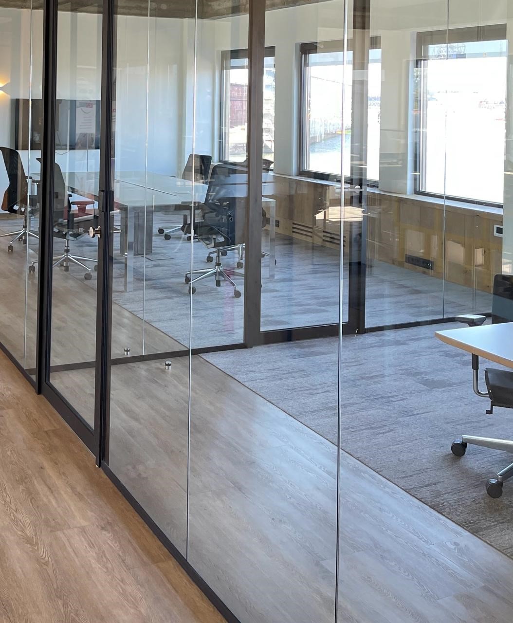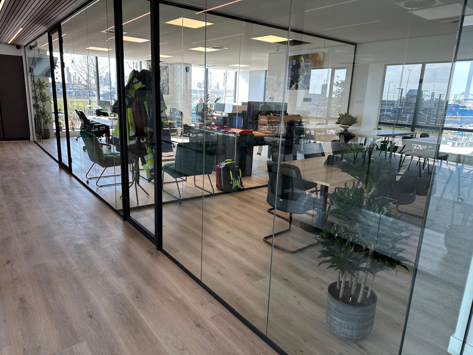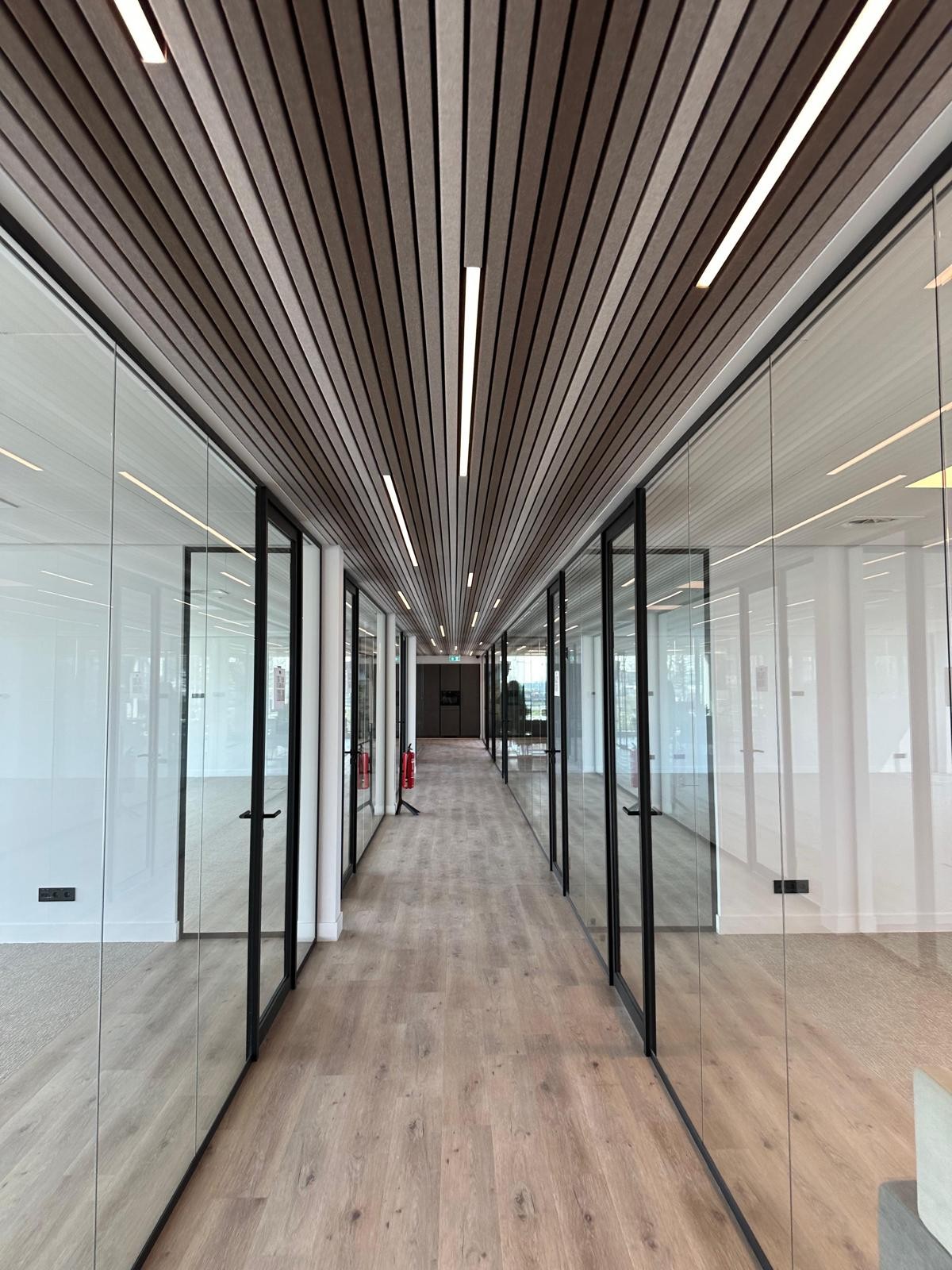 – glazen scheidingswanden en wanden afgewerkt met houten accenten;