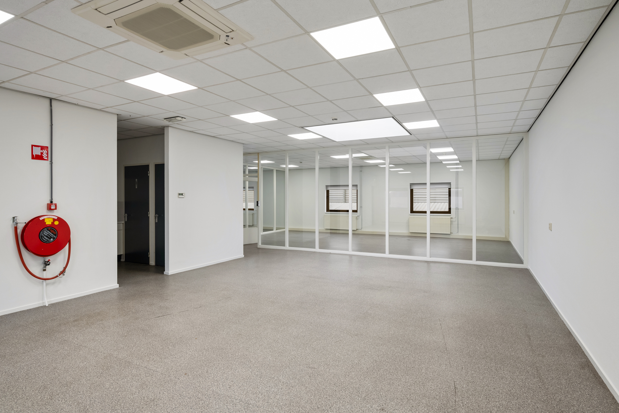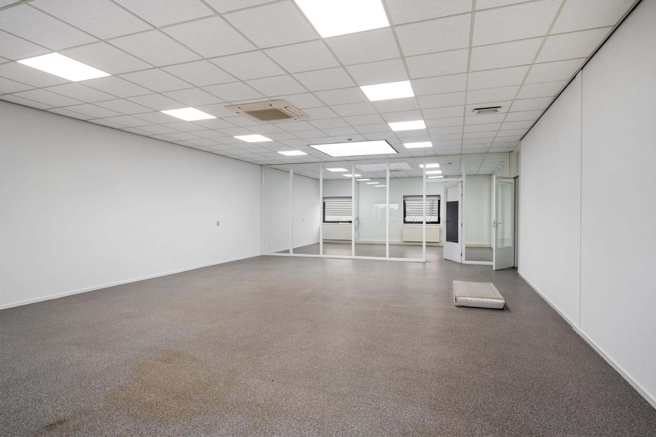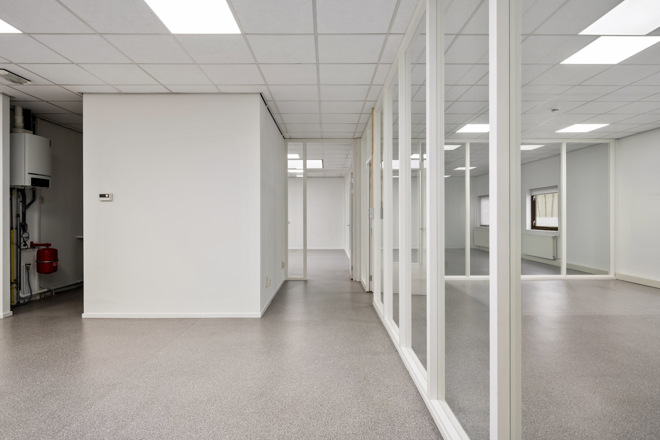 De kantoorruimte beschikt over ruim voldoende raampartijen in zowel de voor- en achtergevel, glazen scheidingswanden, een keurige betegelde toiletgroep (M/V), wandcontactdozen en plaatradiatoren aangesloten op de cv-installatie.