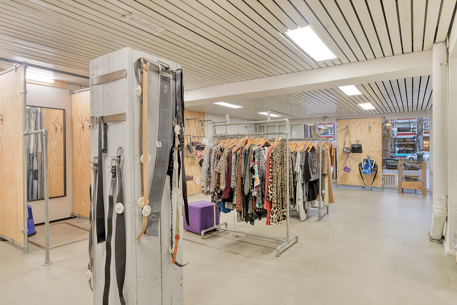BEGANE GROND (groot 564 m2): overdekte entree MW 255-257, totale ruimte op de begane grond beslaat 564 m2 en is o.a. voorzien van 2 vides (plafondhoogte 5,28 m), grote open verkoopruimte met enorme etalage, achter(personeels) entree aan Pannekoekstraat met goederenlift, 3 expeditie entree-puien aan achterzijde Pannekoekstraat met rolluiken, diverse toiletten en 2 kleedkamer met douche en toilet