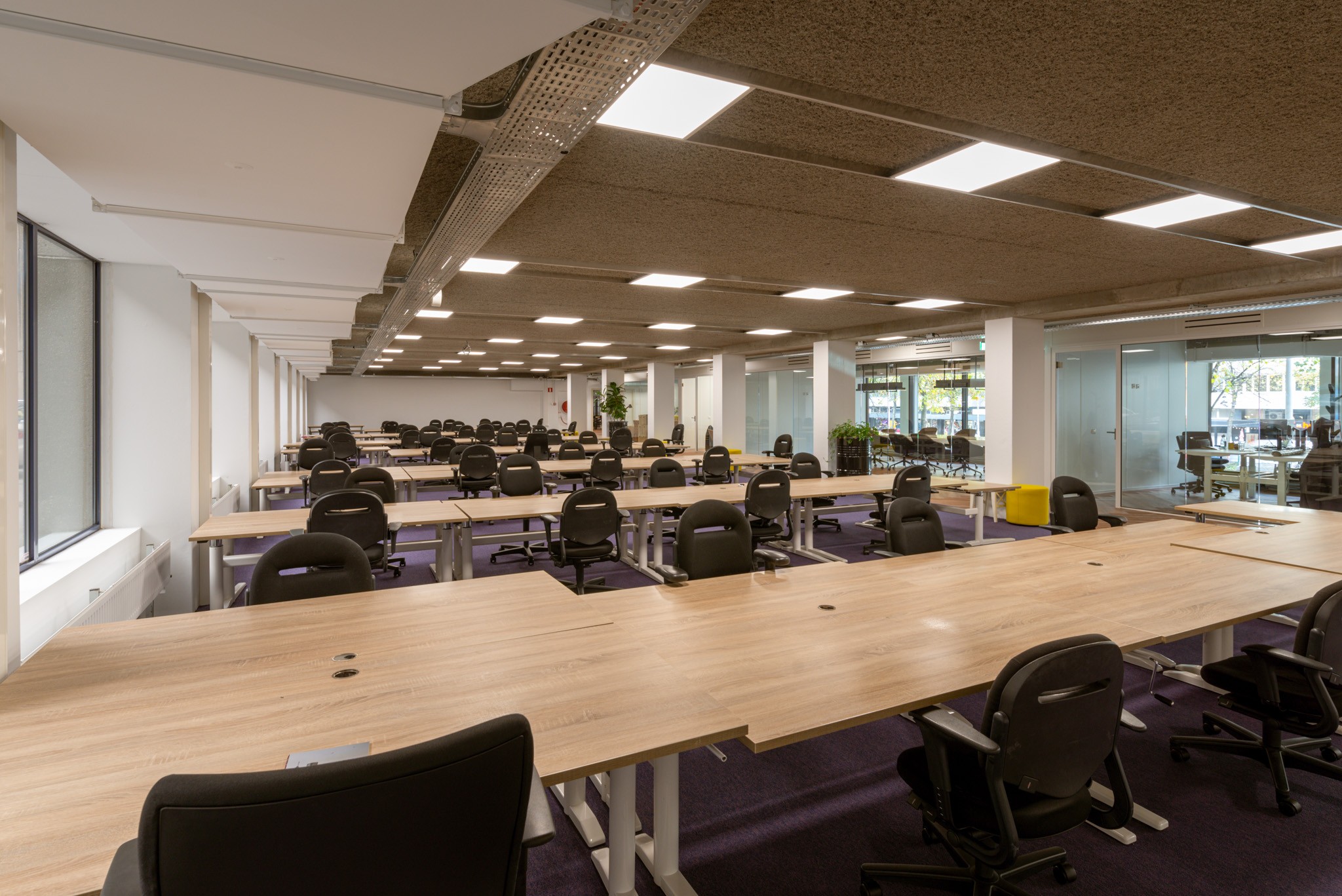 – Industrieel plafond met akoestische plafondafwerking en led verlichting (eerste verdieping);